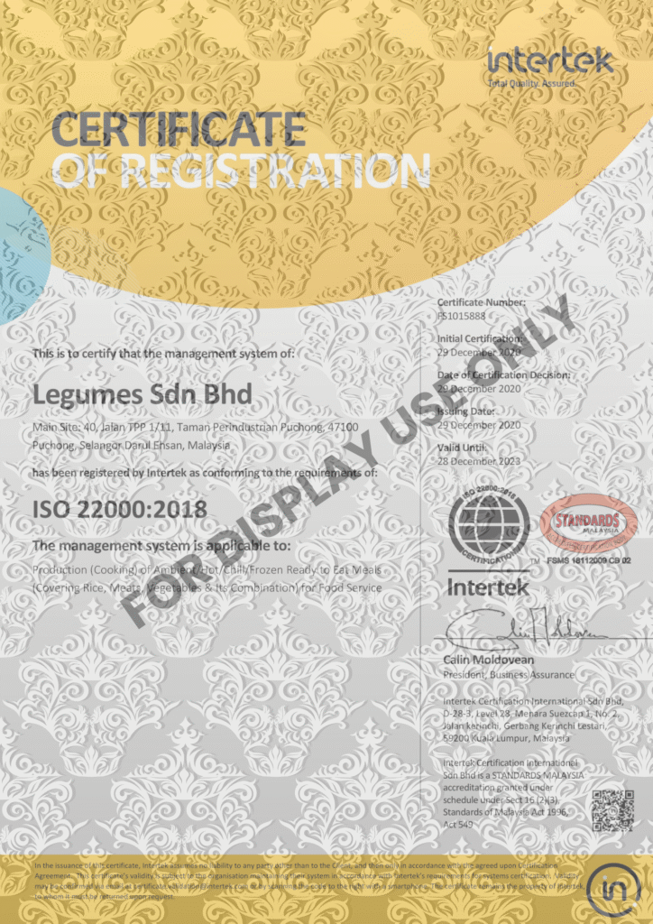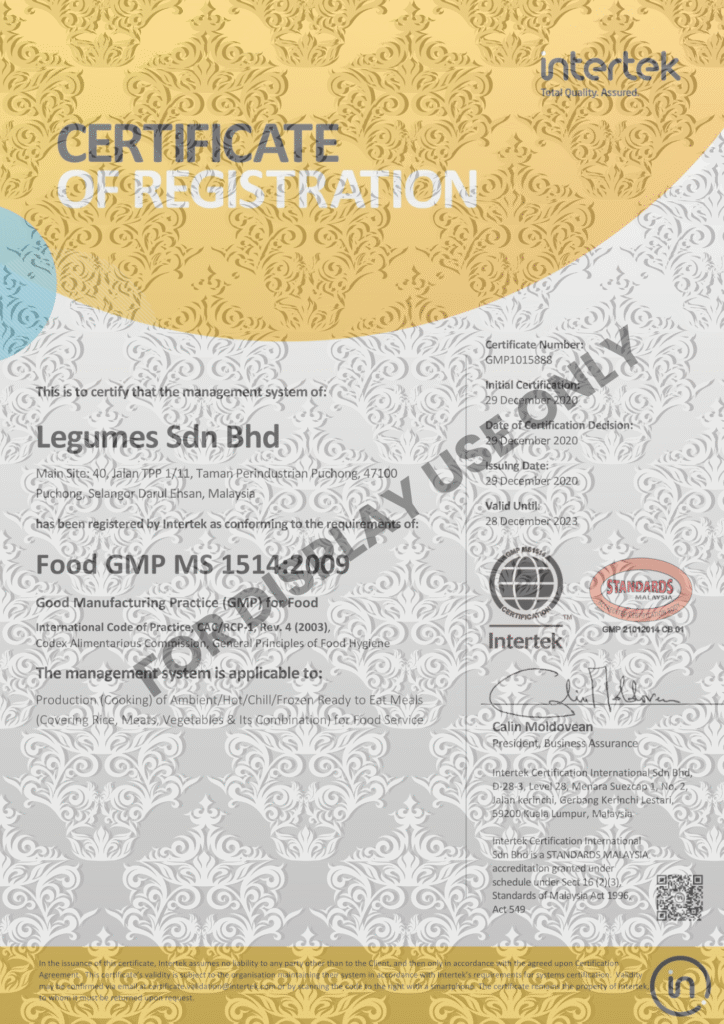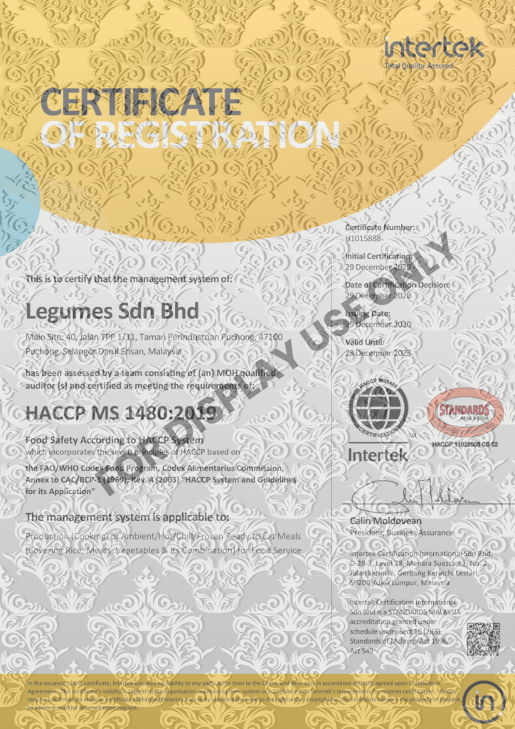 LEGUMES have set up the Halal Committee comprising Muslim Halal Officer to be responsible for all matters pertaining to Halal compliance and Halal Management System. This integrated halal process starts from control of raw materials to manufacturing, packing, storing and distributing the products so that it is halal, quality and safe for consumption.